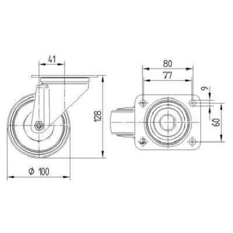Rolă pivotantă , furcă din tablă din oţel, ambutisată, zincată, rând dublu de bile în capul pivotant, sistem de prindere tip placa ,axul rotii cu surb si piulita ,flansa antipraf.Jantă din poliamida, Suprafaţă de rulare: cauciuc elastic cu , rulment cu colivie cu ace.