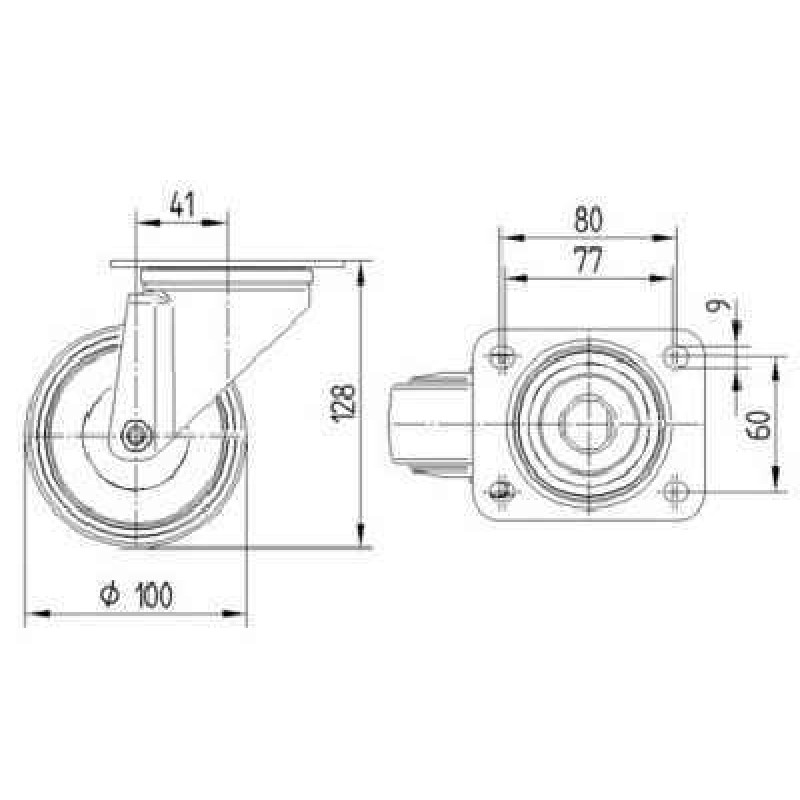 Rolă pivotantă din poliamida , furcă din tablă din oţel, ambutisată, zincată, rând dublu de bile în capul pivotant, sistem de prindere tip placa ,axul rotii cu surub si piulita , rulment plan (bucsa antifrictiune).