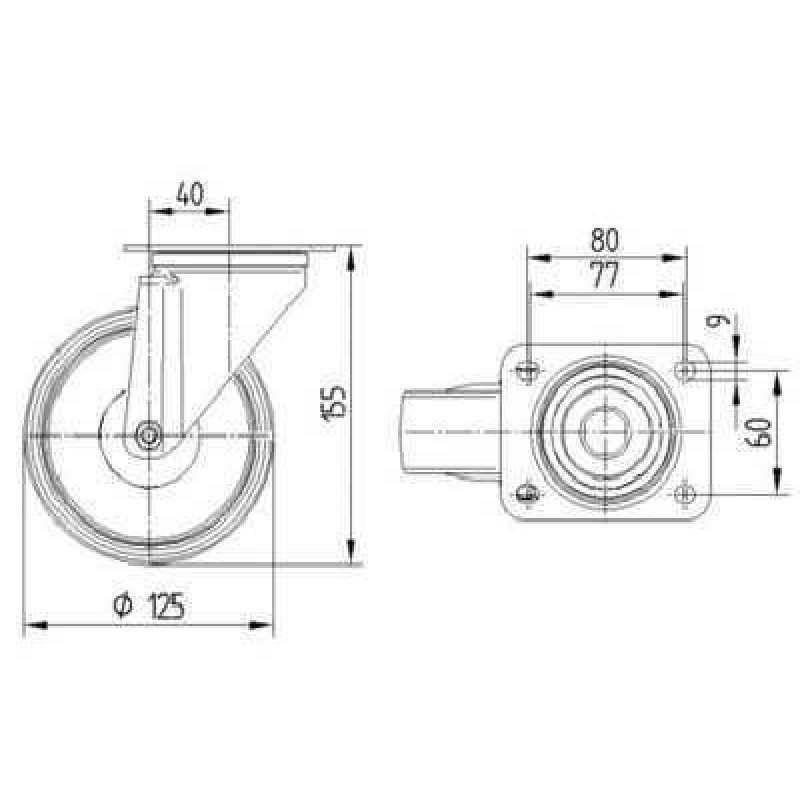 Rolă pivotantă din poliamida , furcă din tablă din oţel, ambutisată, zincată, rând dublu de bile în capul pivotant, sistem de prindere tip placa ,axul rotii cu surub si piulita , rulment plan (bucsa antifrictiune).