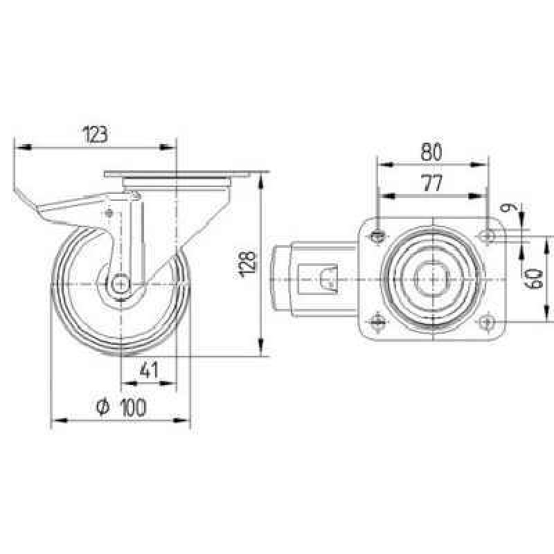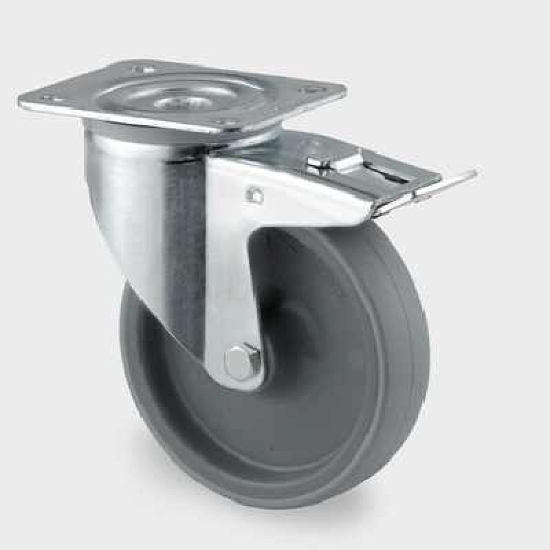 Rolă pivotantă cu blocare totala, pedala pe partea opusa directiei de rulare. Furcă din tablă din oţel, ambutisată, zincată, cap pivotant cu rulment pe doua randuri de bile, axul rotii cu surub si piulita, flansa antipraf, sistem de prindere tip placa.