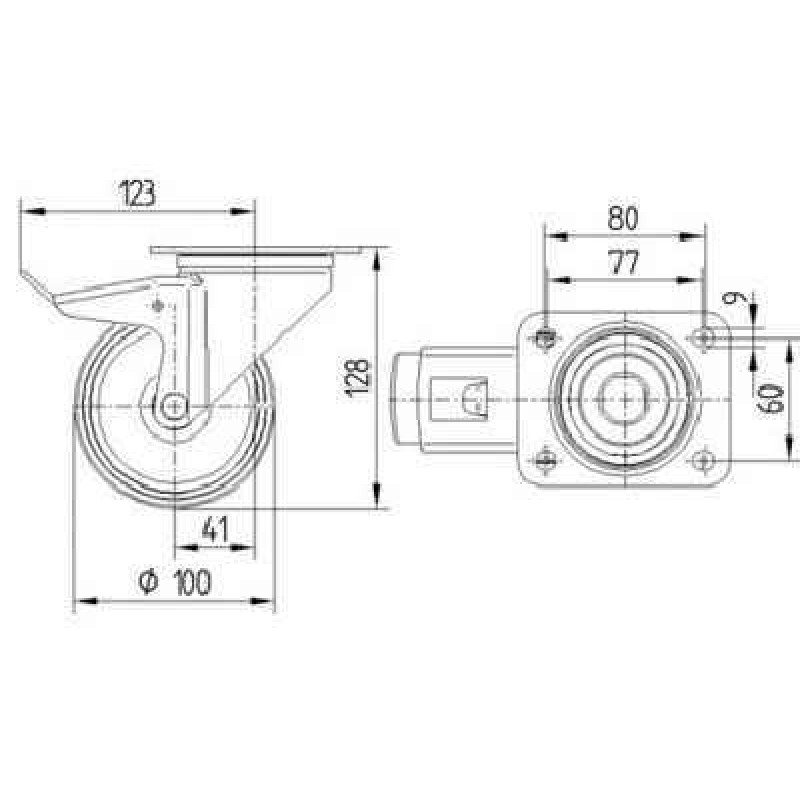 Rolă pivotantă cu frana, furcă din tablă din oţel, ambutisată, zincată, rând dublu de bile în capul pivotant, sistem de prindere tip placa ,axul rotii cu surb si piulita ,flansa antipraf.Jantă din poliamida, Suprafaţă de rulare: poliuretan , rulment cu colivie cu ace.