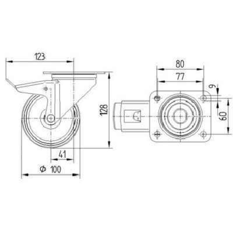 Rolă pivotantă cu frana, furcă din tablă din oţel, ambutisată, zincată, rând dublu de bile în capul pivotant, sistem de prindere tip placa ,axul rotii cu surb si piulita ,flansa antipraf.Jantă din poliamida, Suprafaţă de rulare: cauciuc elastic , rulment de precizie cu colivie cu ace.