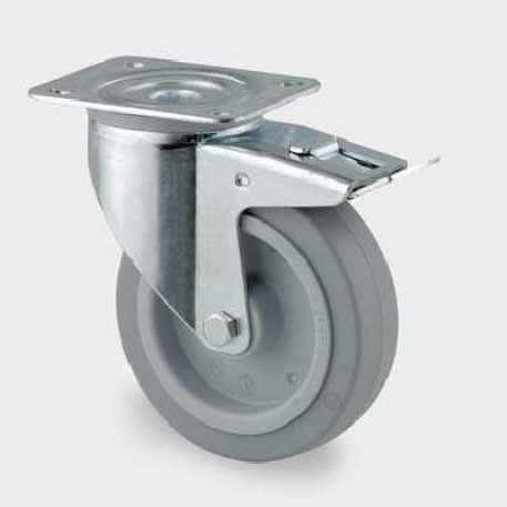 Rolă pivotantă cu frana, furcă din tablă din oţel, ambutisată, zincată, rând dublu de bile în capul pivotant, sistem de prindere tip placa ,axul rotii cu surub si piulita ,flansa antipraf.Jantă din poliamida, Suprafaţă de rulare: cauciuc elastic , rulment de precizie cu colivie cu ace.