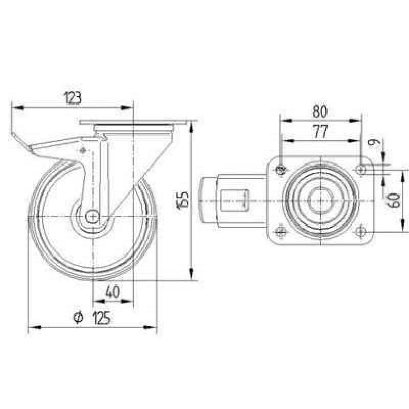 Rolă pivotantă cu frana , furcă din tablă din oţel, ambutisată, zincată, rând dublu de bile în capul pivotant, sistem de prindere tip placa ,axul rotii cu surb si piulita ,flansa antipraf.Jantă din poliamida, Suprafaţă de rulare: cauciuc elastic, rulment cu colivie cu ace.