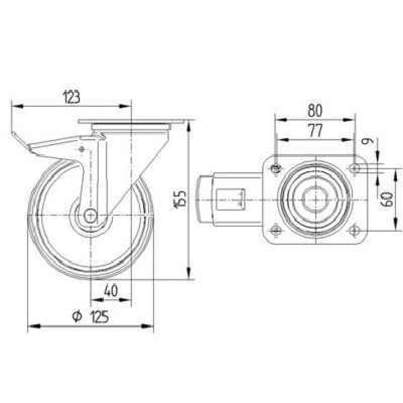 Rolă pivotantă din poliamida cu frana , furcă din tablă din oţel, ambutisată, zincată, rând dublu de bile în capul pivotant, sistem de prindere tip placa ,axul rotii cu surub si piulita , flansa antipraf , rulment plan (bucsa antifrictiune).