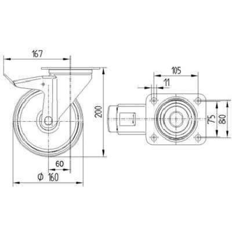 Rolă pivotantă cu frana, furcă din tablă din oţel, ambutisată, zincată, rând dublu de bile în capul pivotant, sistem de prindere tip placa ,axul rotii cu surub si piulita ,flansa antipraf.Jantă din poliamida, Suprafaţă de rulare: poliuretan , rulment cu colivie cu ace.