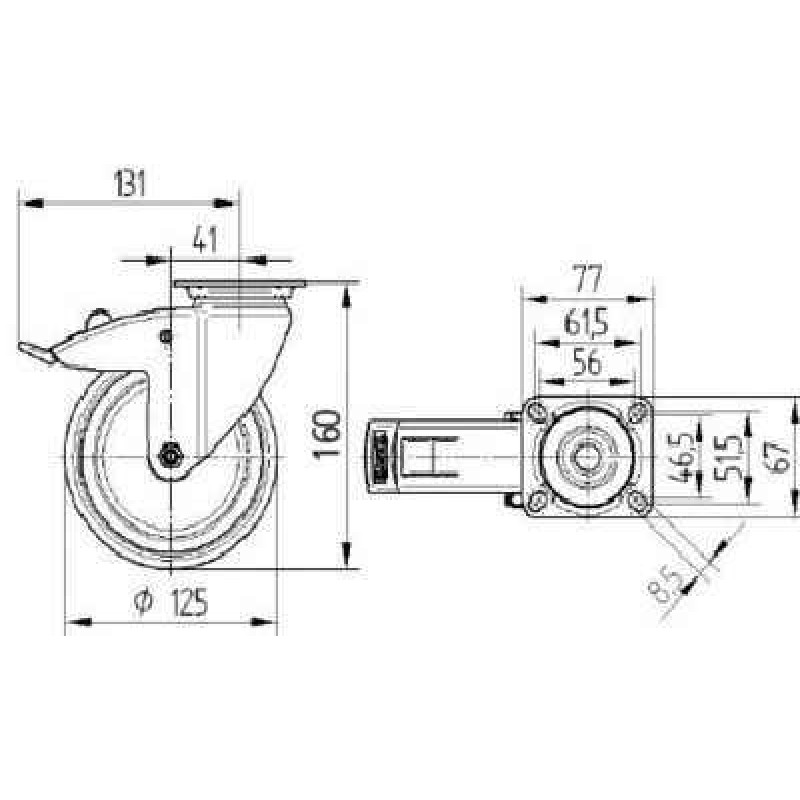 Rolă pivotantă cu blocare totala, pedala pe partea opusa directiei de rulare. Furcă din tablă din oţel, ambutisată, zincată, cap pivotant cu rulment pe doua randuri de bile, axul rotii cu surub si piulita, flansa antipraf, sistem de prindere tip placa.