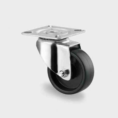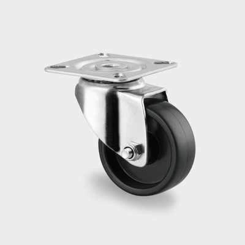 Rola pivotantă, furca din tabla din otel, ambutisata, zincata, rand dublu de bile in capul pivotant, sistem de prindere tip placa.