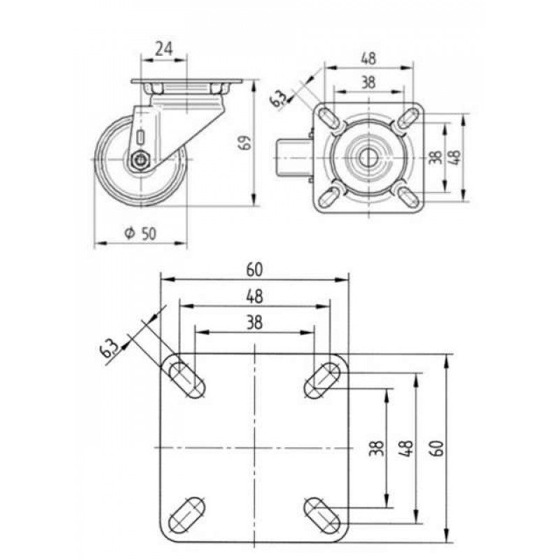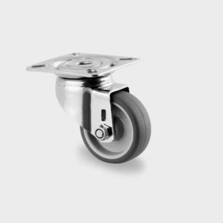 Roată pivotantă, furcă din oţel inoxidabil, bile pe două rânduri, axul roţii cu şurub şi piuliţă, sistem de prindere tip placă. Jantă din polipropilenă, suprafaţă de rulare din cauciuc gri tip TENTEprene (cauciuc termoplastic), non-marking, rulment plan (bucşă antifricţiune).