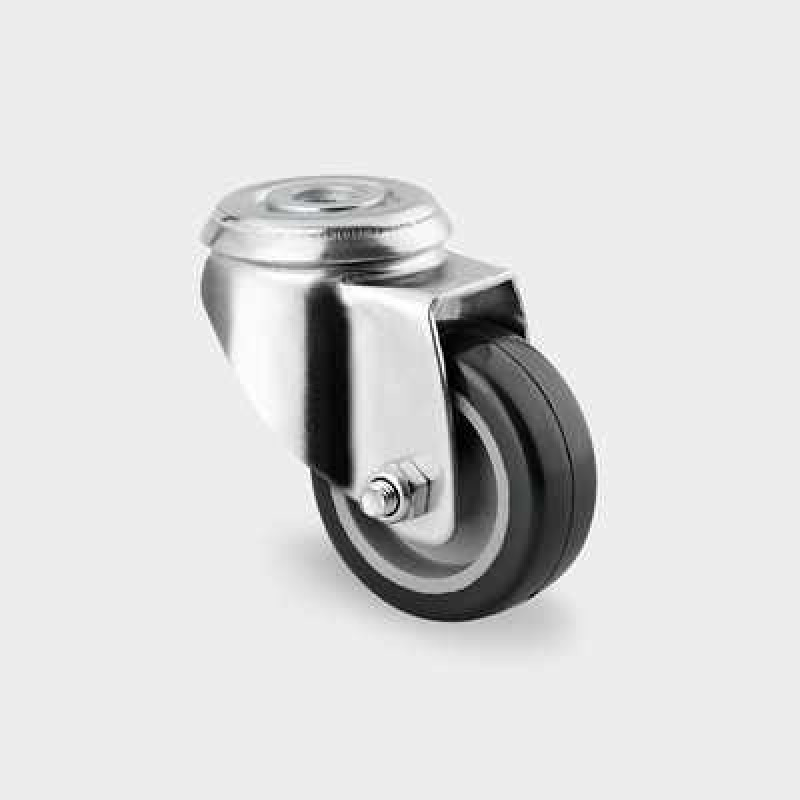 Rolă pivotantă, furcă din tablă din oţel, ambutisată, zincată, rând dublu de bile în capul pivotant, alezaj pentru ax.