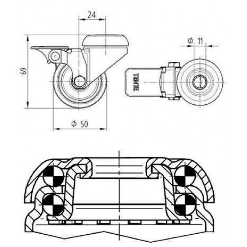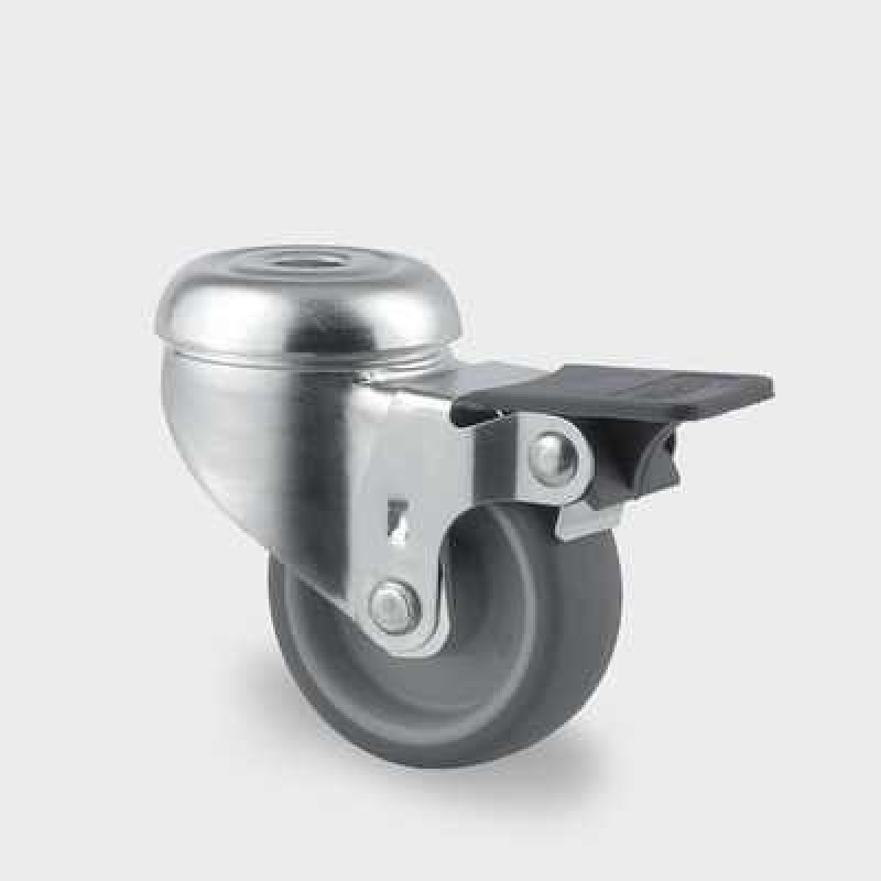 Role pivotante cu blocare pe roată, furcă din tablă din oţel, ambutisată, zincată, rând dublu de bile în capul pivotant, ax nituit, alezaj pentru ax.