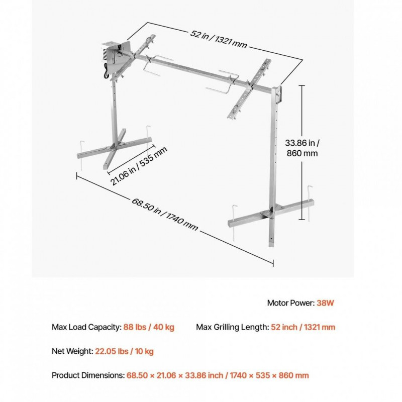 cadrul acestui gratar cu rotisor de 52 inch/1321 mm poate gazdui porci, miei,