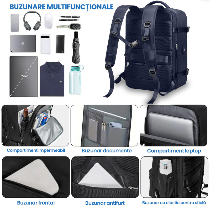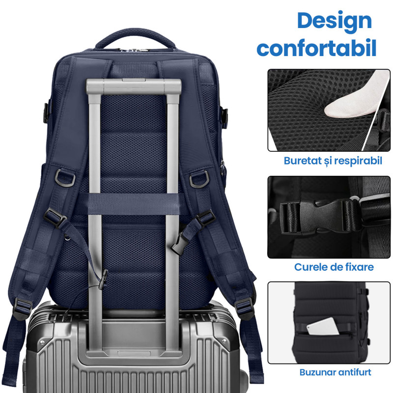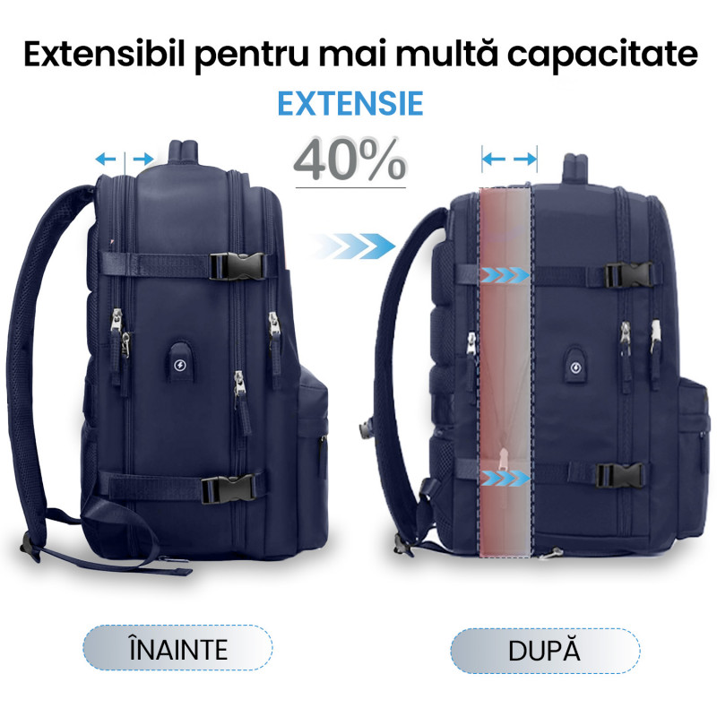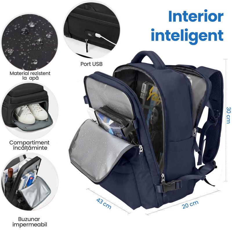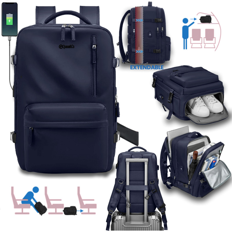 Rucsac Quasar & Co.®, bagaj de mana avion, multifunctional, extensibil, impermeabil, compartiment pantofi, compartiment laptop, sistem agatare pe troler, rucsac calatorie/voiaj pretabil drumetii/scoala, cu USB, textil, 43x30x20-28 cm bleumarin