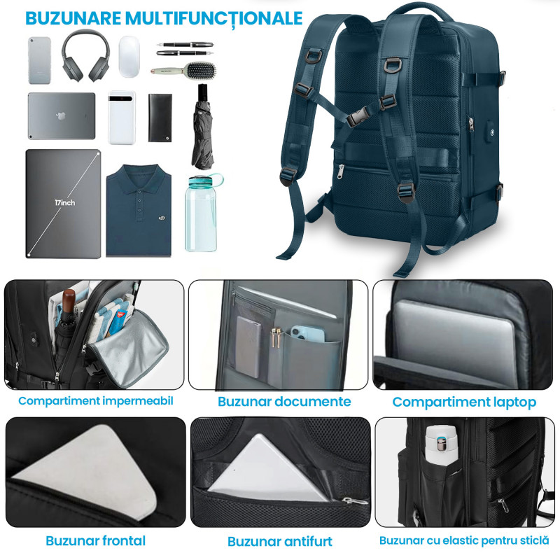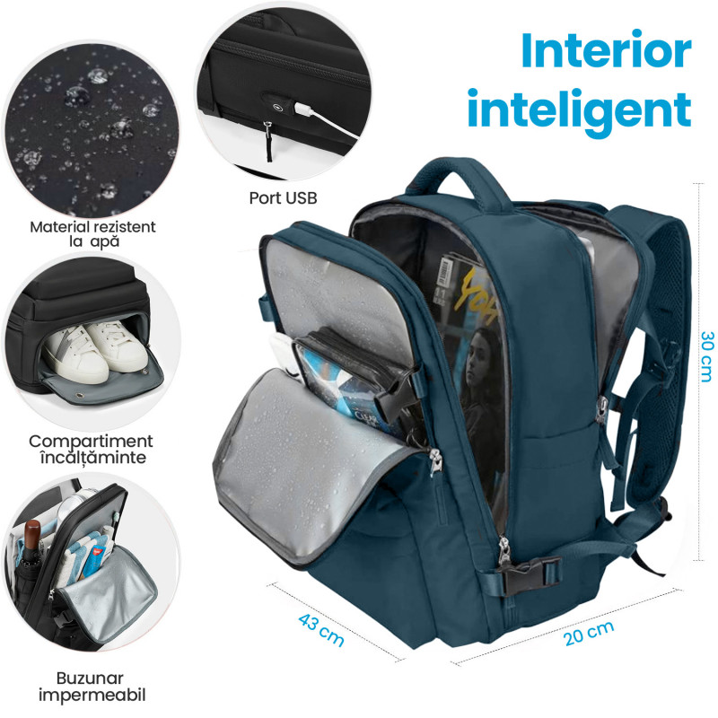 Rucsac Quasar & Co.®, bagaj de mana avion, multifunctional, extensibil, impermeabil, compartiment pantofi, compartiment laptop, sistem agatare pe troler, rucsac calatorie/voiaj pretabil drumetii/scoala, cu USB, textil, 43x30x20-28 cm, verde inchis