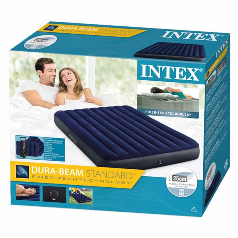Intex 64765 Queen Dura Beam Standard Classic Downy Air Bed 152x203x25 cm Patul gonflabil Intex 64765 Queen Dura Beam Standard Classic Downy Air Bed este conceput pentru cei care iubesc campingul.Fabricat din vinil albastru ultra-rezistent care suporta pana la 273 kg de greutate, precum si oferind o suprafata foarte solida si confortabila datorita structurii sale cu nervuri care dispune de tehnologia noastra Wave-Beam, este rezistent la apa si este echipat cu o supapa dubla pentru o umflare / dezumflare rapida.Partea superioara este captusita cu un material special flocat, care este incredibil de moale la atingere si, in plus, este rezistent la apa, ceea ce adauga si mai multa valoare.Este o saltea robusta si foarte stabila, unde puteti dormi linistit toata noaptea, fara a risca sa se goleasca in mijlocul noptii. Din acest motiv, ea contine, in supapa de umplere, sistemul Air-Lock care impiedica orice pierdere de aer, chiar si sub presiune.Supapa doi in unu va permite sa umflati salteaua in cateva minute, folosind o pompa manuala inclusa in kit. De asemenea, puteti folosi o pompa electrica (nu este inclusa), in cazul in care aveti nevoie sa accelerati procesul de umflare.Sunt incluse doua perne I-Beam si pompa de aer; aceasta este compusa din tehnologia Fiber-tech care ofera combinatia perfecta de stabilitate si confort.Dezumflarea si plierea lor este la fel de usoara si rapida, permitand depozitarea in orice spatiu, deoarece dobandeste o forma foarte compacta dupa golire. Specificatii Culoare albastra
