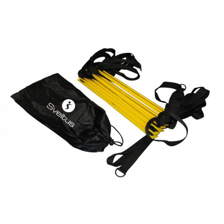 Scara de alergare si coordonare este proiectata pentru cresterea vitezei in regim de coordonare. Permite executarea unei game variate de exercitii. Utilizati scara de antrenament pentru a va imbunatati agilitatea picioarelor.Poate fi utilizata in sali de fitness, la domiciliu sau in aer liber. Recomandata in antrenamentul fotbalistilor si antrenamentele functionale.Dimensiune: 5 m x 42 cm. Include 10 trepte ce pot fi ajustate la distanta dorita.Include geanta de transport.Culoare: negru cu galbenGreutate: 0,73 kgProducator: SVELTUS