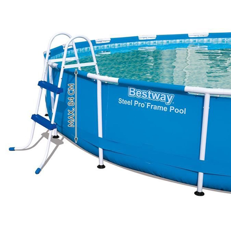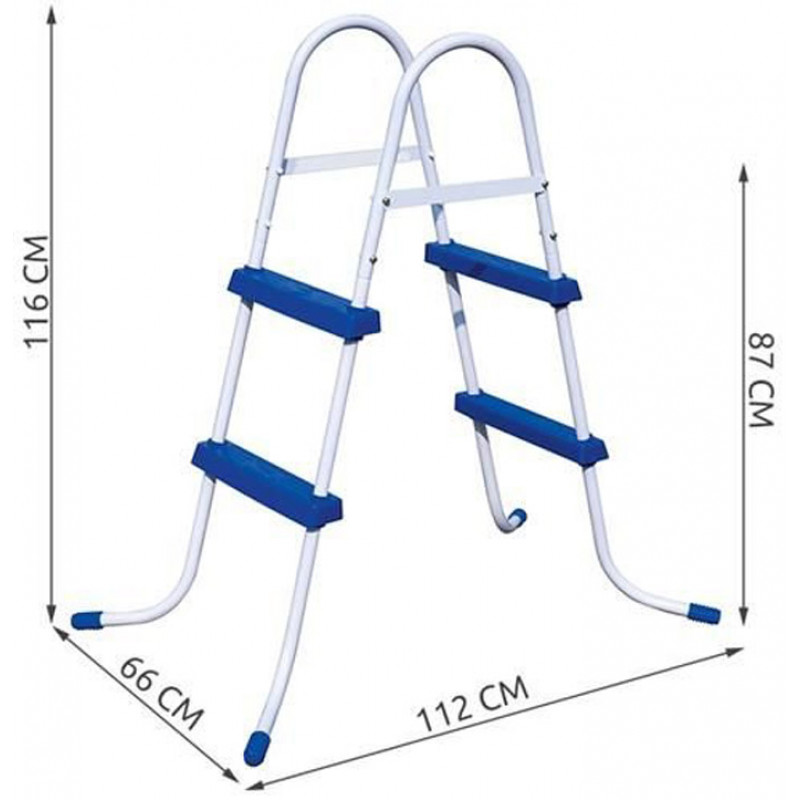 Scara pentru piscina cu 2 trepte Flowclear, 84 cm Aceasta scara Flowclear pentru piscina de la Bestway, proiectata pentru piscine supraterane, va ajuta inotatorii sa intre si sa iasa din piscina in siguranta si cu usurinta. Scara pentru piscina cu 2 trepte dispune de un cadru robust din metal rezistent la rugina. Treptele antiderapante din plastic durabil sunt ferm atasate la cadru, oferind o cale sigura de intrare sau iesire pentru inotatori. In plus, scara dispune si de 2 manere solide.Scara de siguranta pentru piscina este adecvata pentru piscinele supraterane cu o inaltime maxima de 84 cm. Este usor de asamblat.
