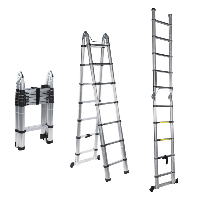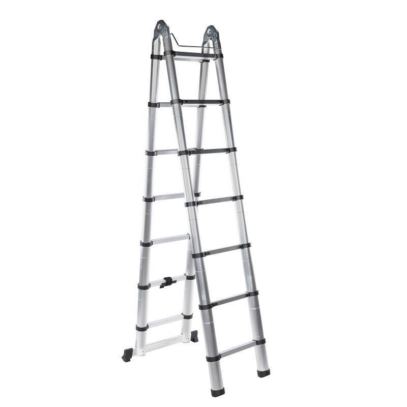 Scara aluminiu, telescopica, dubla, 14 trepte, inaltime maxima 4,4 m, Detoolz DZ-C247 poate ajunge in numai cateva secunde de la o forma compacta la inaltimea sa maxima, sau poate fi extinsa treapta cu treapta, la inaltimi intermediare, astfel incat sa obtineti inaltimea de lucru adecvata si un unghi de sprijin optim pentru siguranta dumneavoastra.