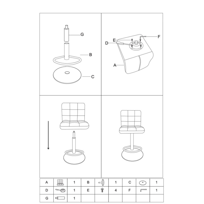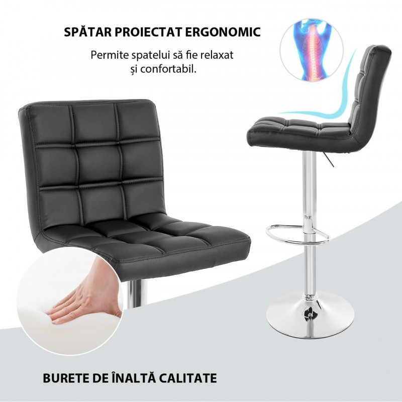 Scaunul este reglabil pe inaltime intre 60.5 cm si 81.5 cm. Scaunul are spatar, ceea ce il face si mai confortabil in timpul utilizarii. Este potrivit pentru unitati de catering, birouri, saloane de infrumusetare si uz casnic.