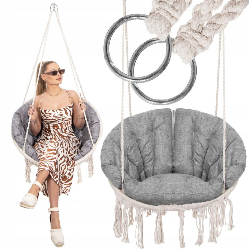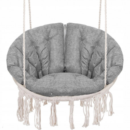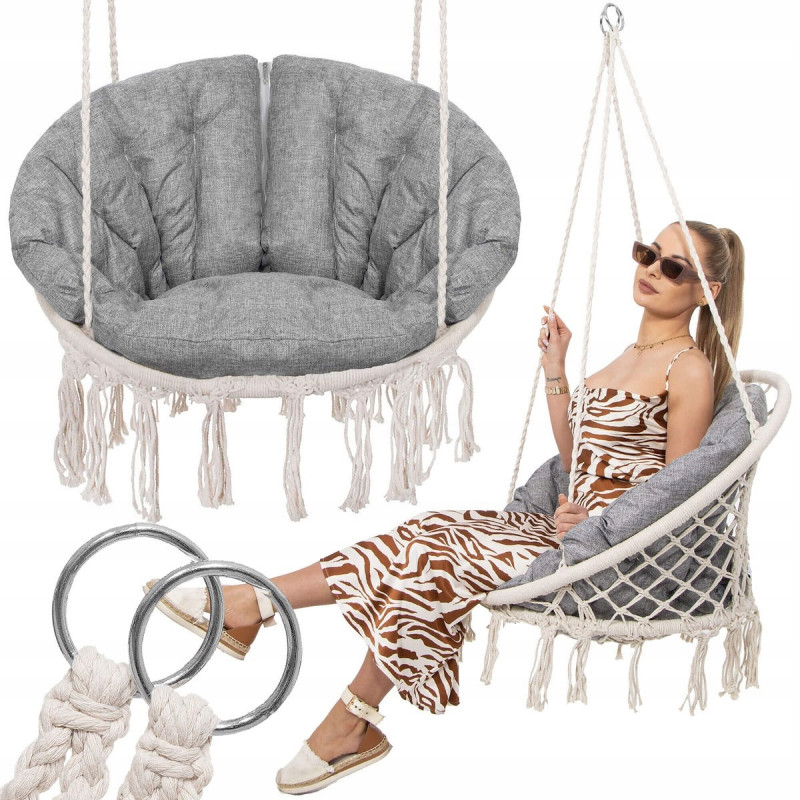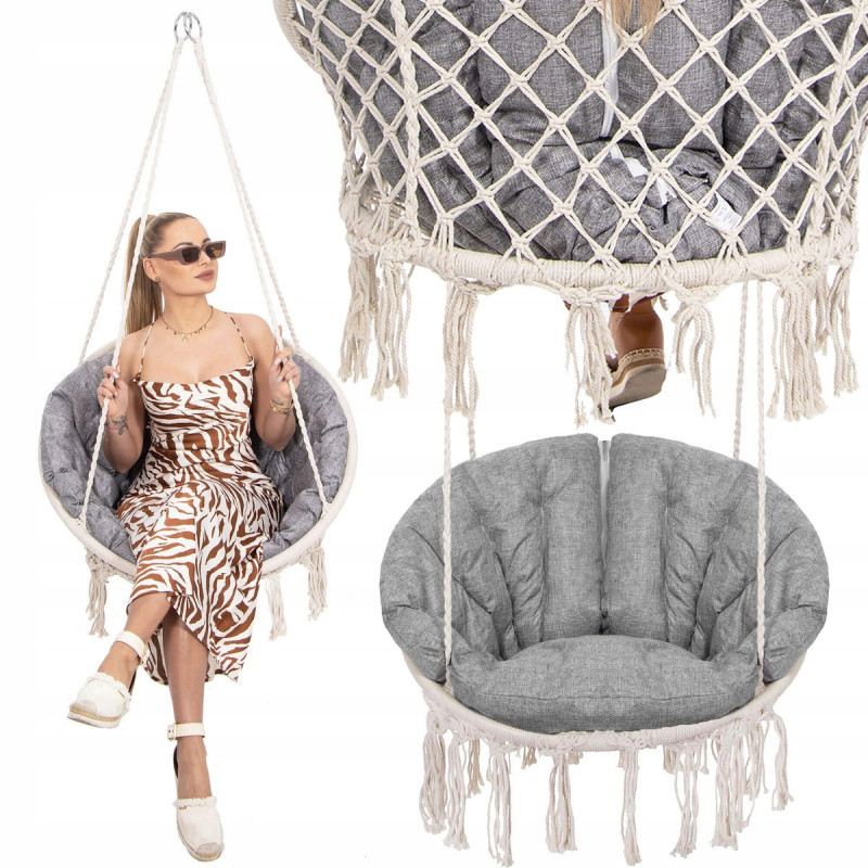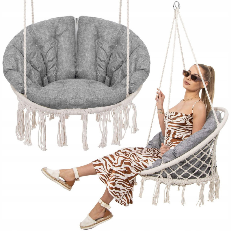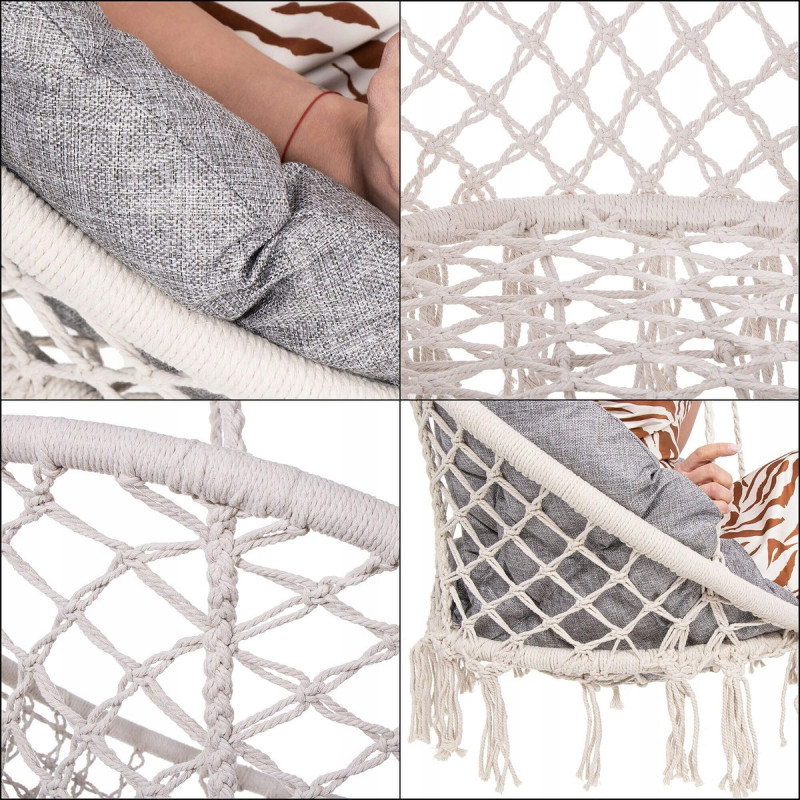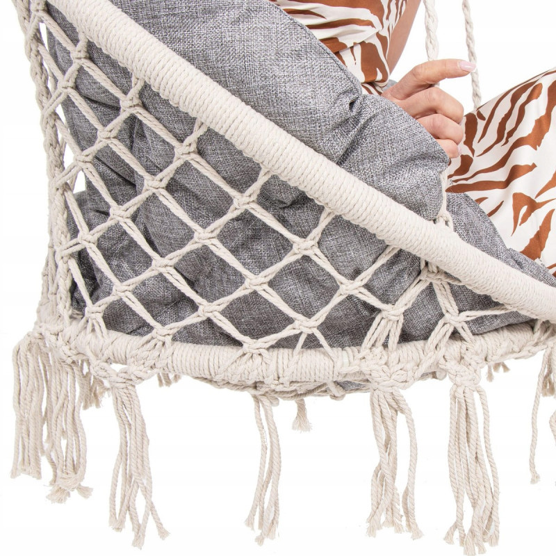 Fotoliul suspendat cu perna de la este un hit sigur al sezonului. Se potriveste in majoritatea amenajarilor din gradina, de pe terasa, sau din interiorul casei - in camera de zi sau in camera copiilor. Le va oferi copiilor o joaca sigura si plina de distractie, iar adultilor o relaxare fericita. Ciucurii la moda in stil boho, culoarea frumoasa si o impletitura puternica de franghie confera leaganului suspendat un aspect uimitor. Franghiile impletite estetic si cercurile groase legate cu ele ofera rezistenta si confort. Perna moale, de marime potrivita, completeaza perfect ansamblul. Optati pentru un design interesant si faceti relaxarea si mai placuta. Agatati leaganul cuib de barza oriunde doriti. Este o decoratiune geniala pentru interioare - originala, eleganta si in acelasi timp usoara si practica. Va conferi interiorului dvs. un aspect confortabil si neobisnuit. Este o solutie perfecta pentru camerele copiilor, unde mamele pot sa se legene si sa ii hraneasca pe cei mici. Pentru a fi mai usor de agatat, corzile pe care este agatat leaganul sunt finisate cu roti metalice. Puteti agata cu usurinta scaunul in doua moduri. Modul in care doriti sa utilizati leaganul depinde de dumneavoastra!Perna pentru cuibul de barza, a fost realizata cu cea mai mare grija. Culoarea cea mai la moda si tesatura distincta ii adauga farmec si atractivitate. Va va permite sa va odihniti mai confortabil si mai comod. Avantajul sau incontestabil este tesatura din care este confectionata husa pernei - groasa, cu o tesatura distincta. Bumbacul, o fibra naturala care este non-alergenica si confera un aspect rafinat, este un mare avantaj al husei. Este completarea perfecta a leaganului.Inclus: perna pentru scaun