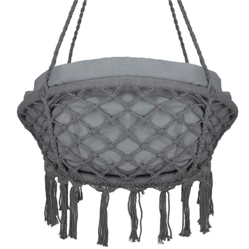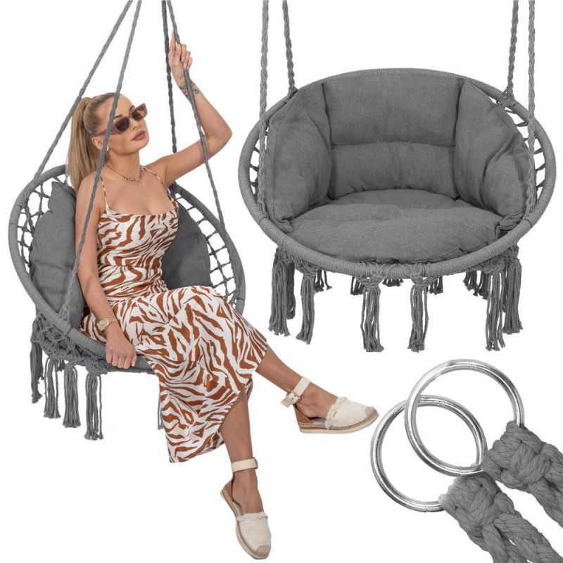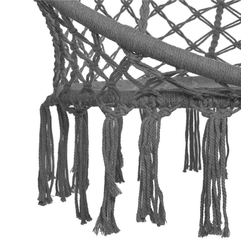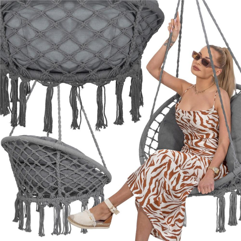 Fotoliul suspendat cu perna de la este un hit sigur al sezonului. Se potriveste in majoritatea amenajarilor din gradina, de pe terasa, sau din interiorul casei - in camera de zi sau in camera copiilor. Le va oferi copiilor o joaca sigura si plina de distractie, iar adultilor o relaxare fericita. Ciucurii la moda in stil boho, culoarea frumoasa si o impletitura puternica de franghie confera leaganului suspendat un aspect uimitor. Franghiile impletite estetic si cercurile groase legate cu ele ofera rezistenta si confort. Perna moale, de marime potrivita, completeaza perfect ansamblul. Optati pentru un design interesant si faceti relaxarea si mai placuta. Agatati leaganul cuib de barza oriunde doriti. Este o decoratiune geniala pentru interioare - originala, eleganta si in acelasi timp usoara si practica. Va conferi interiorului dvs. un aspect confortabil si neobisnuit. Este o solutie perfecta pentru camerele copiilor, unde mamele pot sa se legene si sa ii hraneasca pe cei mici. Pentru a fi mai usor de agatat, corzile pe care este agatat leaganul sunt finisate cu roti metalice. Puteti agata cu usurinta scaunul in doua moduri. Modul in care doriti sa utilizati leaganul depinde de dumneavoastra!Perna pentru cuibul de barza, a fost realizata cu cea mai mare grija. Culoarea cea mai la moda si tesatura distincta ii adauga farmec si atractivitate. Va va permite sa va odihniti mai confortabil si mai comod. Avantajul sau incontestabil este tesatura din care este confectionata husa pernei - groasa, cu o tesatura distincta. Bumbacul, o fibra naturala care este non-alergenica si confera un aspect rafinat, este un mare avantaj al husei. Este completarea perfecta a leaganului.Inclus: perna pentru scaun