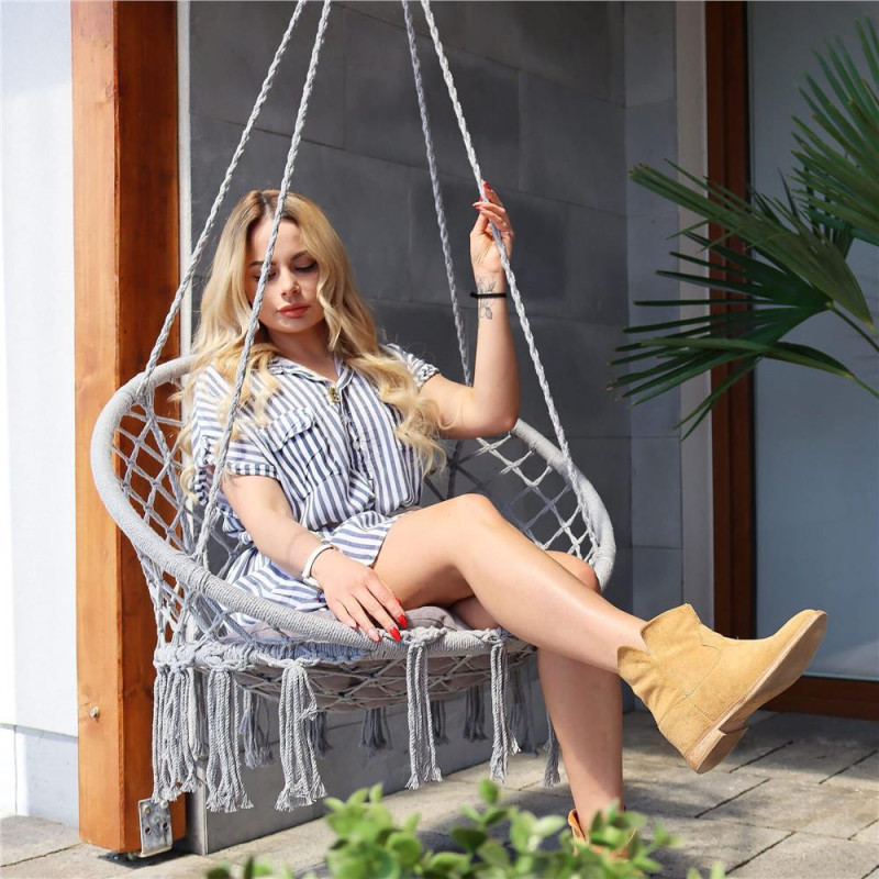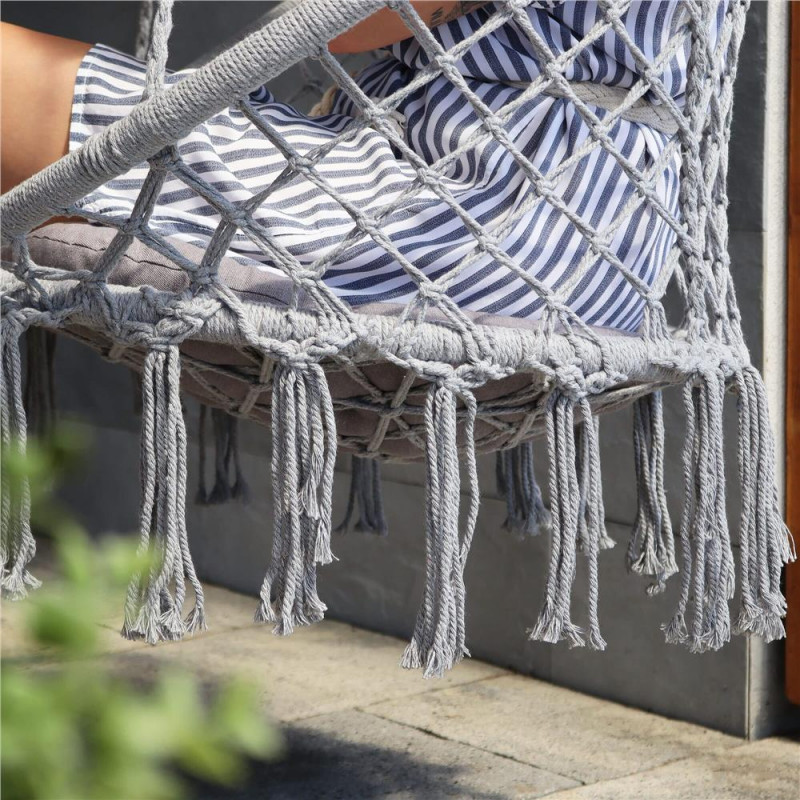 Leagan modern cu franjuri ce se potriveste perfect atat in casa cat si in gradina. Datorita spatarului confortabil, va bucura de relaxarea oferita dupa o zi grea.Greutatea maxima admisa este de 150kg.