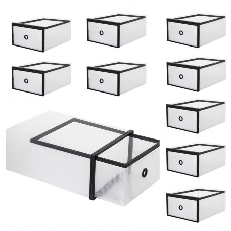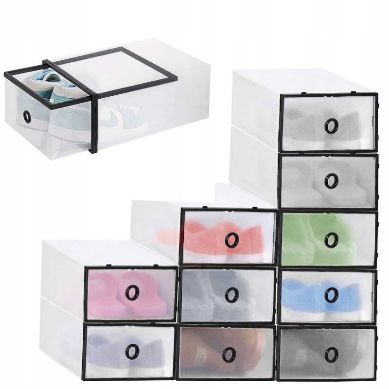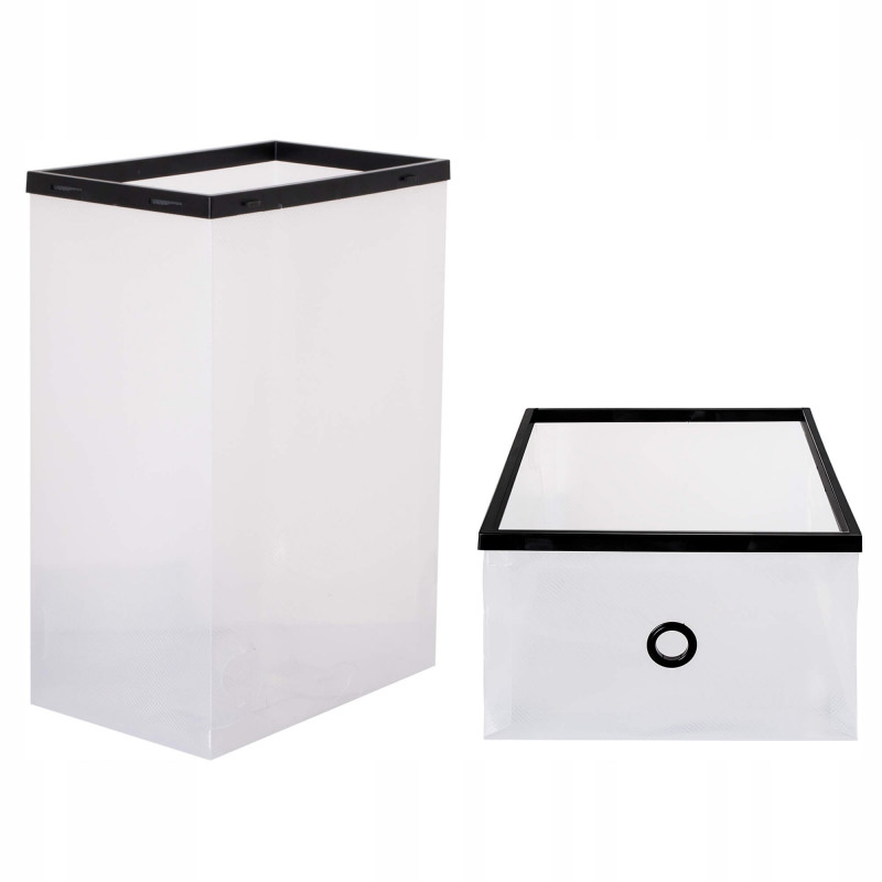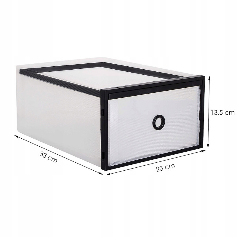 Caracteristici: - set 2 cutii pentru incaltaminte;- potrivite pentru a depozita si organiza incaltamintea;- realizate din ABS translucid;- usor de vazut ce este in interior;- prevazute cu rama neagra in partea din fata;- protejeaza incaltamintea de praf, murdarie si umiditate;- deschidere/inchidere capac cu ajutorul clapetei;- dimensiuni cutie 13x23x33 cm;- culoare transparent