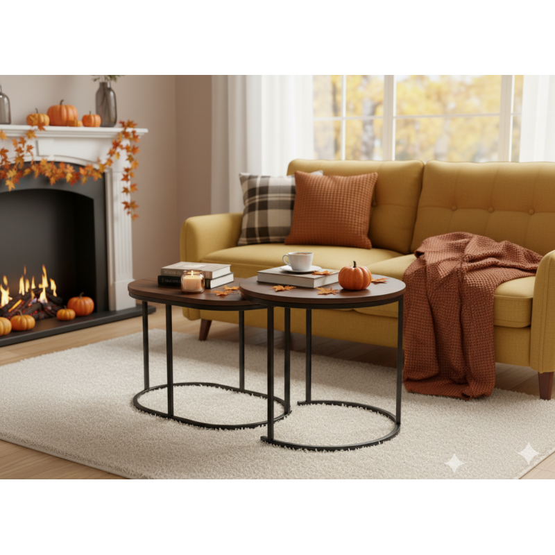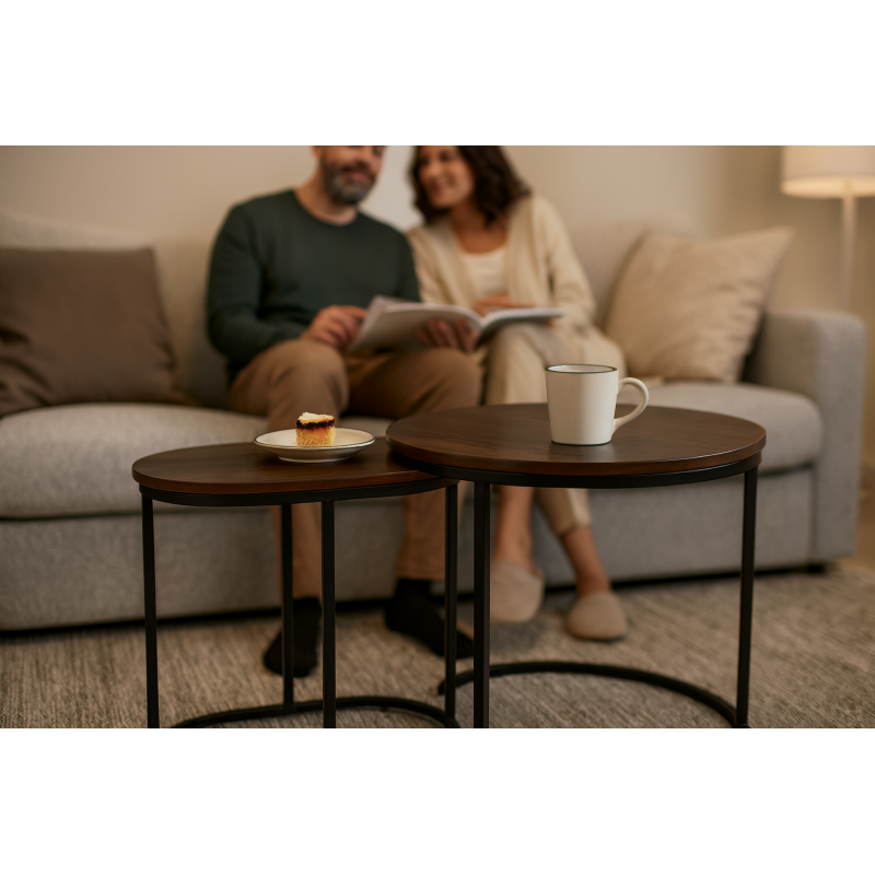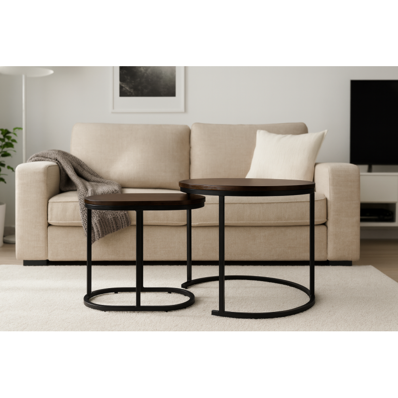 Scurta descriere Setul de doua masute de cafea este o solutie moderna si practica pentru living. Blaturile din MDF cu finisaj maro imita aspectul natural al lemnului, iar cadrul metalic negru ofera stabilitate si un stil contemporan potrivit pentru diverse amenajari. Masutele pot fi folosite impreuna sau separat, in functie de spatiu si necesitati.