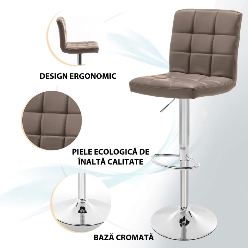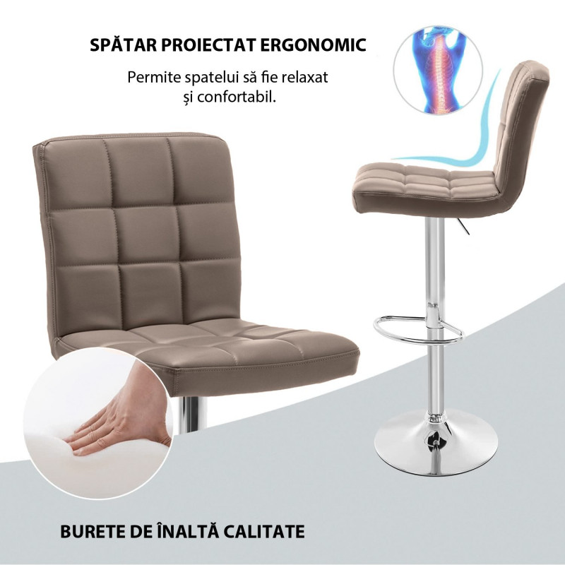 Scaunele sunt reglabile pe inaltime intre 60.5 cm si 81.5 cm. Scaunele au si spatar, ceea ce le face si mai confortabile in timpul utilizarii. Sunt potrivite pentru unitati de catering, birouri, saloane de infrumusetare si uz casnic.