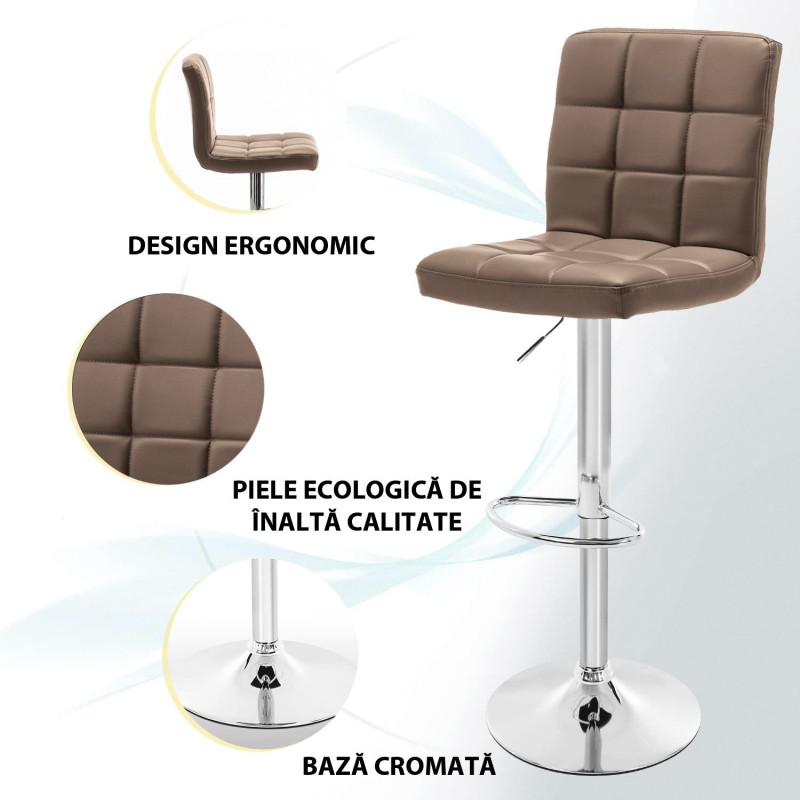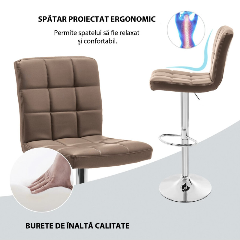 Scaunele sunt reglabile pe inaltime intre 60.5 cm si 81.5 cm. Scaunele au si spatar, ceea ce le face si mai confortabile in timpul utilizarii. Sunt potrivite pentru unitati de catering, birouri, saloane de infrumusetare si uz casnic.