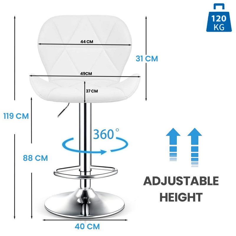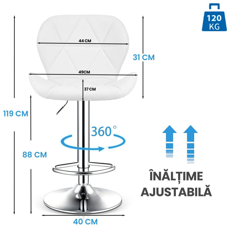 Scaunele sunt reglabile pe inaltime ajungand pana la 88 cm inalatimea sezutului. Scaunele au si spatar, ceea ce le face si mai confortabile in timpul utilizarii. Sunt potrivite pentru unitati de catering, birouri, saloane de infrumusetare si uz casnic.