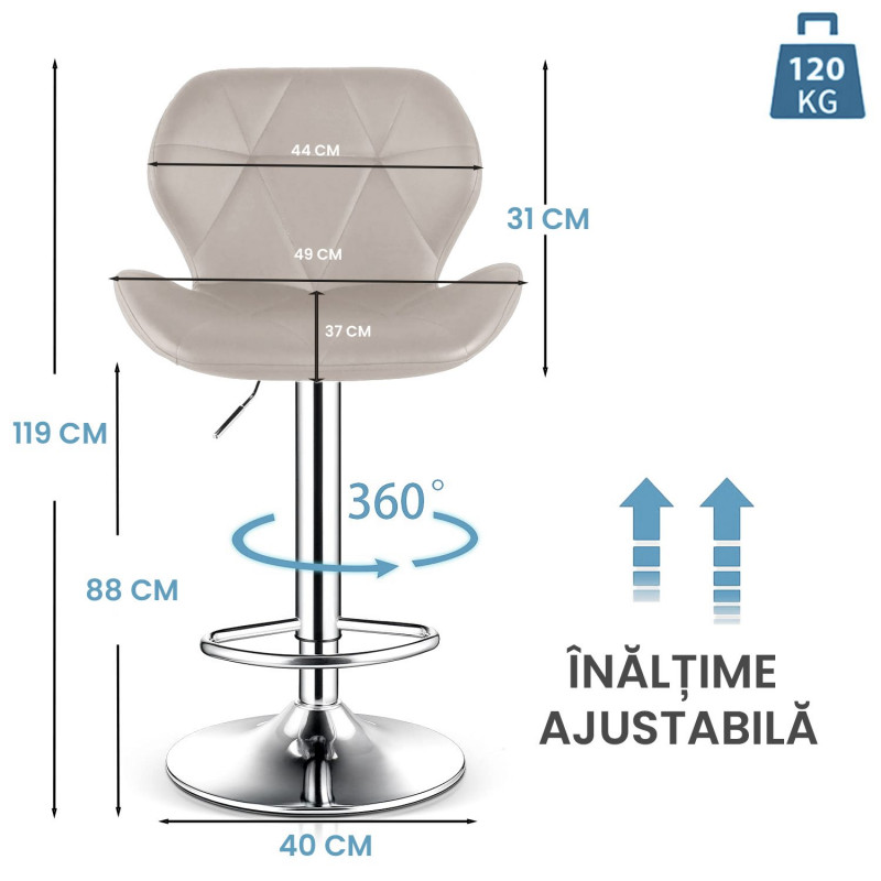 Scaunele sunt reglabile pe inaltime ajungand pana la 88 cm inalatimea sezutului. Scaunele au si spatar, ceea ce le face si mai confortabile in timpul utilizarii. Sunt potrivite pentru unitati de catering, birouri, saloane de infrumusetare si uz casnic.