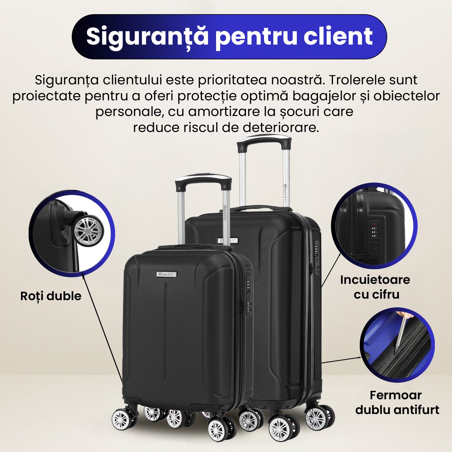 Perfecte pentru calatorii cu avionul, setul de 2 trolere cu dimensiunile de 40 x 30 x 20 cm si 55 x 35 x 20 cm dispune de 4 roti duble cu rotatie de 360° pentru manevrabilitate usoara. Fabricate din ABS rezistent, au manere telescopice, cifru si fermoar antifurt pentru siguranta.