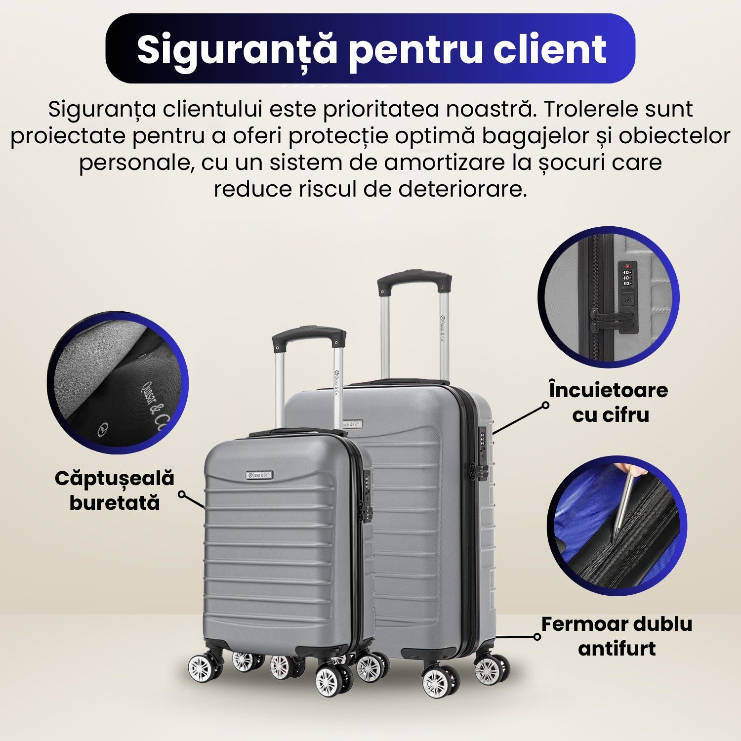 Perfecte pentru calatorii cu avionul, setul de 2 trolere cu dimensiunile de 40 x 30 x 20 cm si 55 x 36 x 20 cm dispune de 4 roti duble cu rotatie de 360° pentru manevrabilitate usoara. Fabricate din ABS rezistent, au manere telescopice, cifru si fermoar antifurt pentru siguranta.