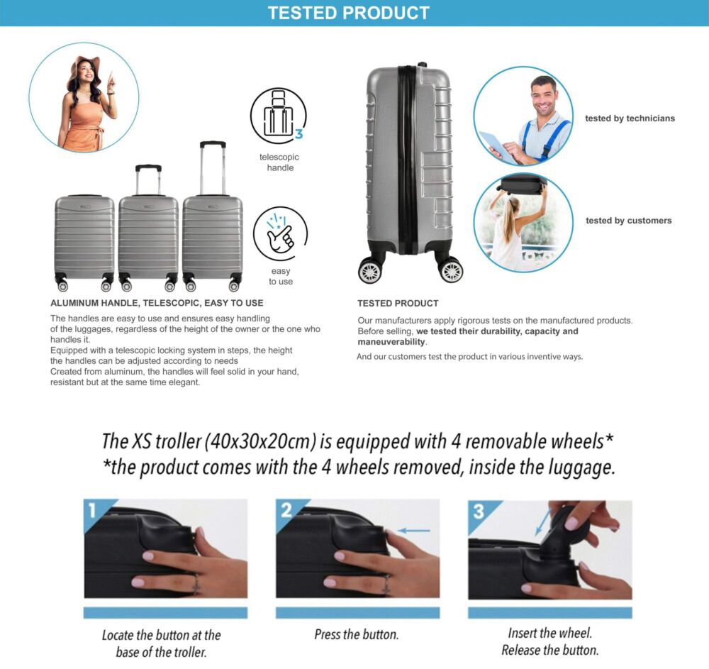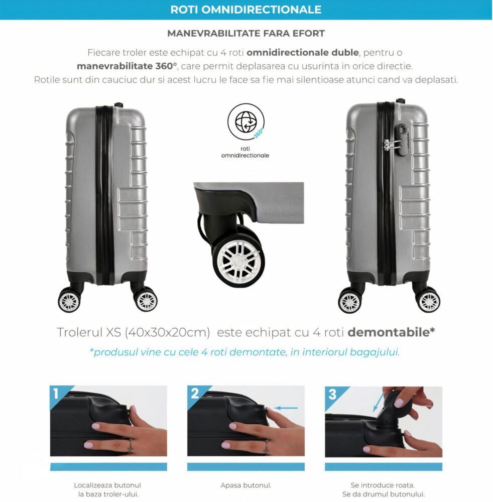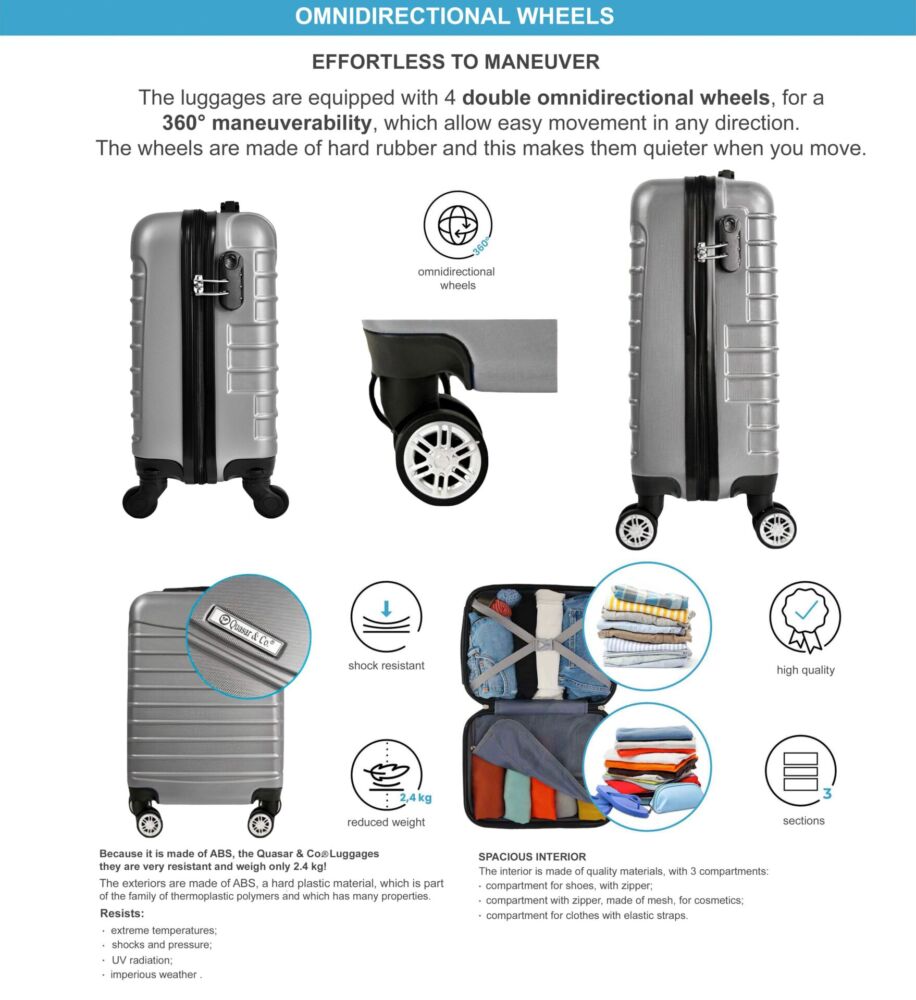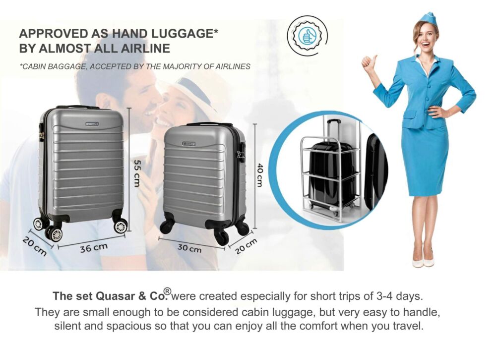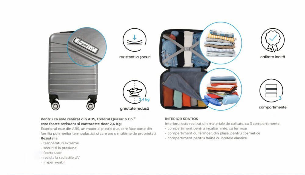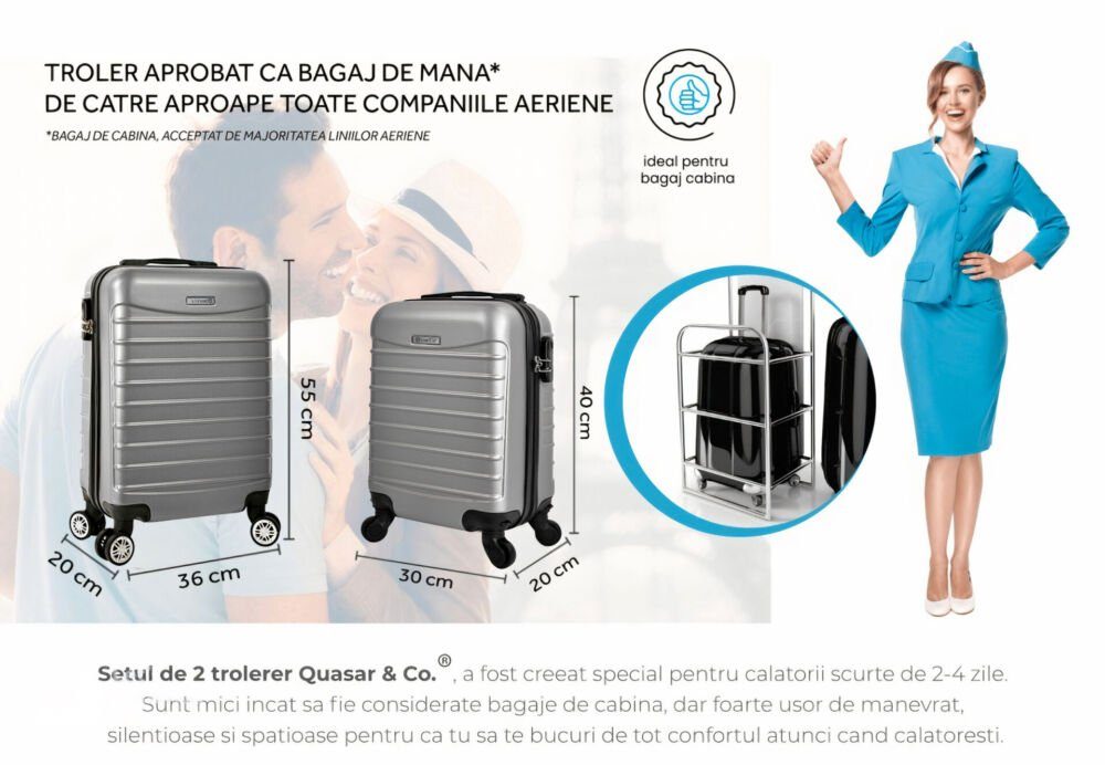 Trolerele XS si S de la Quasar & Co.® , a fost create special pentru calatorii. Sunt mici incat sa fie considerate bagaje de cabina, dar foarte usor de manevrat, silentiose si spatiose pentru ca tu sa te bucuri de tot confortul atunci cand calatoresti.