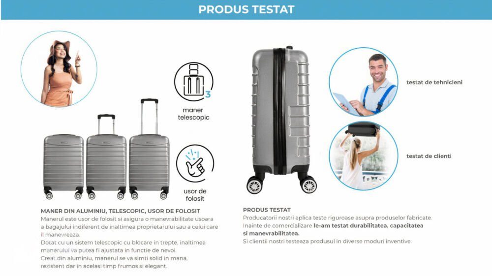 Manerul este usor de folosit si asigura o manevrabilitate usoara a bagajului, indiferent de inaltimea proprietarului sau a celui care il manevreaza.