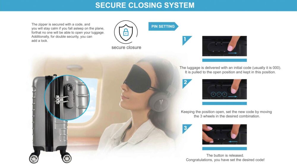 Fermoarul este securizat cu cifru, iar tu vei sta linistit chiar daca adormi in avion pentru ca nimeni nu va putea deschide bagajul tau. Suplimentar, pentru dubla siguranta, poti adauga si un lacatel.