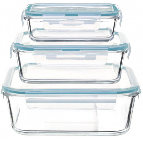 Scurta descriere Setul de 3 recipiente patrate din sticla borosilicata 5 Five Clipeat este ideal pentru depozitarea alimentelor in conditii sigure. Rezistente si practice, acestea sunt dotate cu capace albastre ermetice care pastreaza prospetimea continutului, fiind potrivite pentru frigider sau transport.