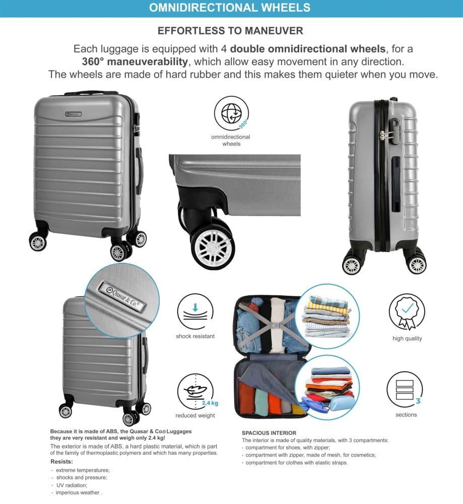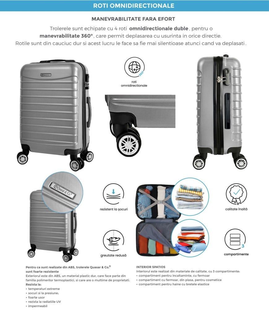 Trolerul S de la Quasar & Co.® , a fost creat special pentru calatorii. Este mic incat sa fie considerat bagaj de cabina, dar foarte usor de manevrat, silentios si spatios pentru ca tu sa te bucuri de tot confortul atunci cand calatoresti.