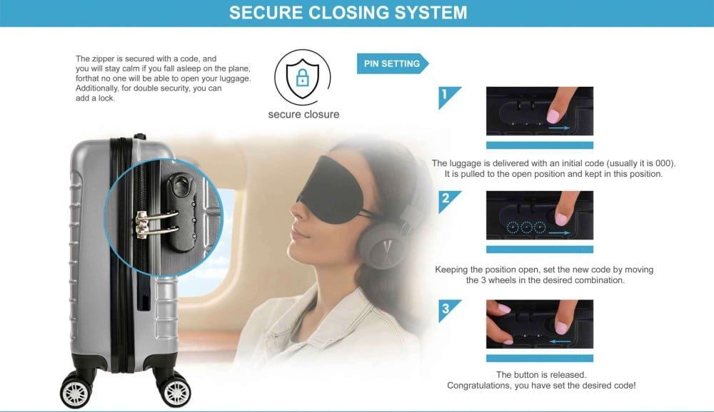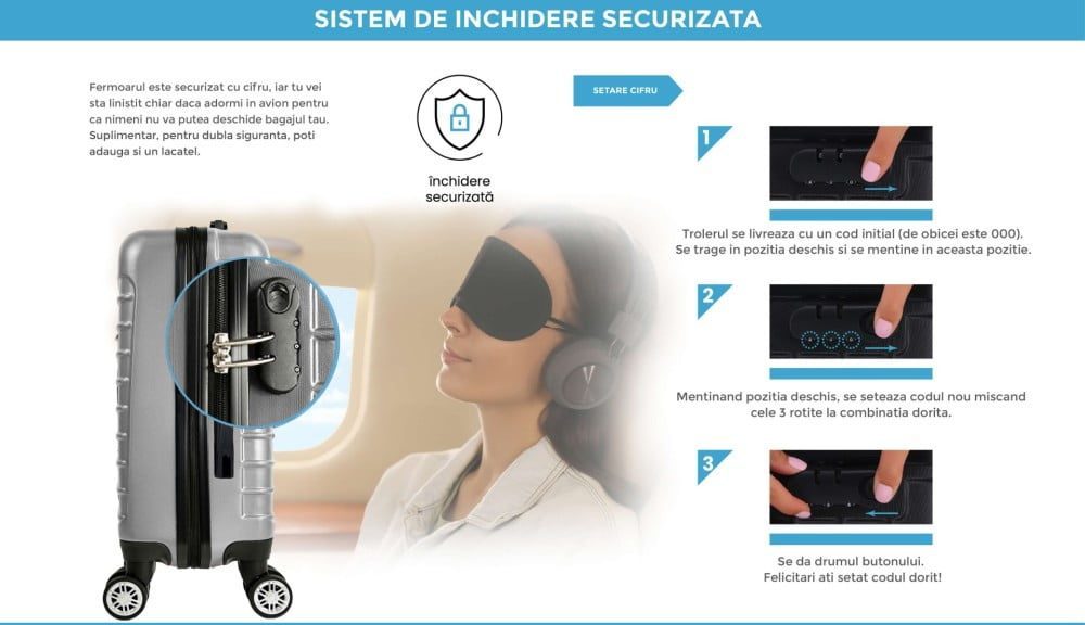 Fermoarul este securizat cu cifru, iar tu vei sta linistit chiar daca adormi in avion pentru ca nimeni nu va putea deschide bagajul tau. Suplimentar, pentru dubla siguranta, poti adauga si un lacatel.