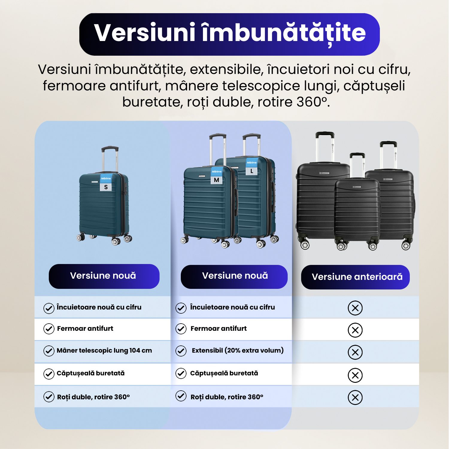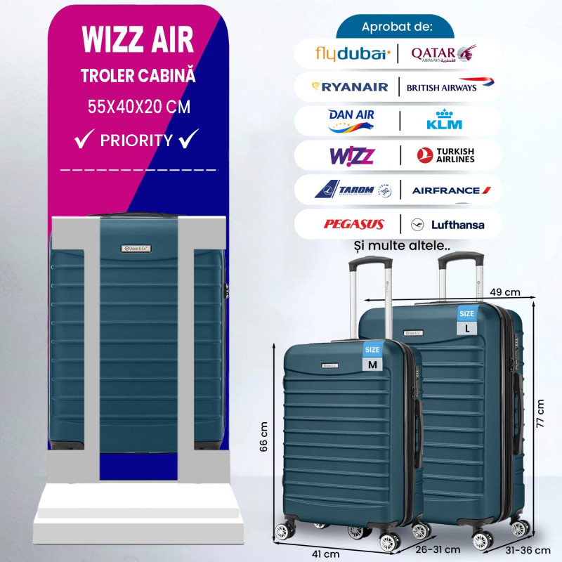 - Dimensiuni optime: Cu dimensiuni de de 55 x 36 x 20 cm, 66 x 41 x 26-31 cm si 77 x 49 x 31-36 cm, aceste trolere pot fi utilizate ca bagaj de mana / cala pentru toate companiile aeriene. (verificati conditiile liniei aeriene inainte de a calatori)