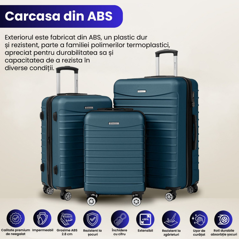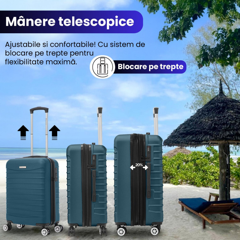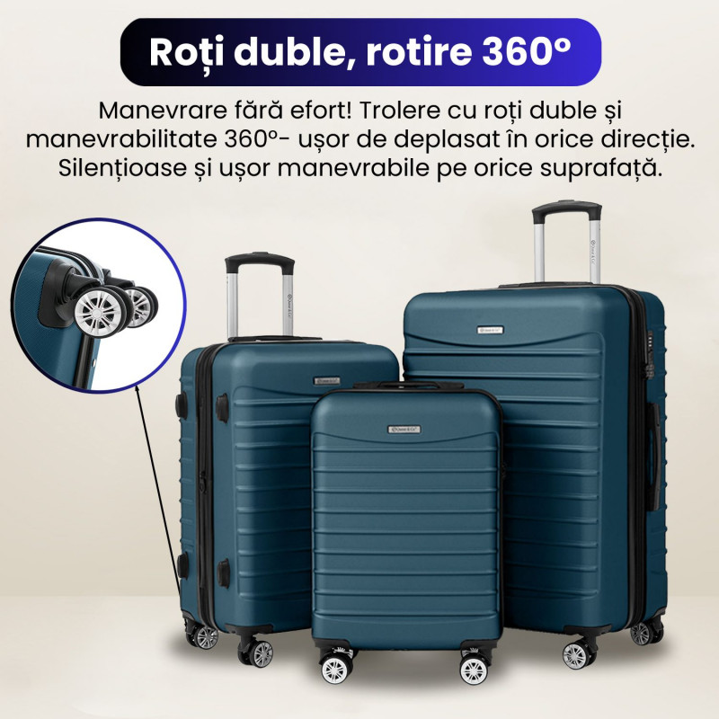 Perfecte pentru calatorii cu avionul, setul de 3 trolere cu dimensiunile de 55 x 36 x 20 cm, 66 x 41 x 26-31 cm si 77 x 49 x 31-36 cm dispune de 4 roti duble cu rotatie de 360° pentru manevrabilitate usoara. Fabricate din ABS rezistent, au manere telescopice, cifru si fermoar antifurt pentru siguranta.