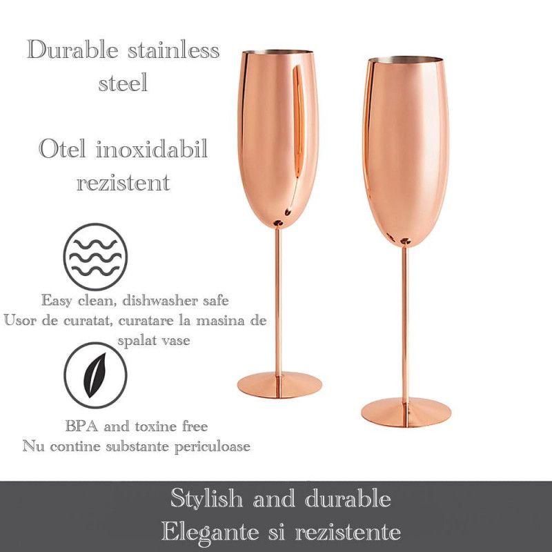 Paharele Quasar & Co., pentru sampanie sunt confectionate din inox ce combina elemente unice de design, executie ingrijita si tehnologie de ultima ora. Paharele Quasar & Co. au un design modern si elegant. Fabricate din inox, paharele de sampanie au o forma eleganta, pentru a oferi straluciri luminoase la fiecare masa si a scoate in evidenta bautura servita. Acest pahar cu picior lung, elegant determina aspectul final a bauturilor de tip sampanie, prosecco sau vin spumant, astfel incat acesta sa fie evidentiat in modul cel mai bun posibil. Paharul are o cupa generoasa, poate fi introdus in masina de spalat vase.