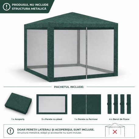 Scurta descriere Setul de pereti pentru pavilion de gradina ofera protectie eficienta impotriva insectelor si intemperiilor usoare. Include 4 pereti prevazuti cu plasa de tantari, dintre care unul are fermoar pentru acces facil. Este ideal pentru inchiderea completa a pavilionului si crearea unui spatiu confortabil in gradina sau pe terasa.