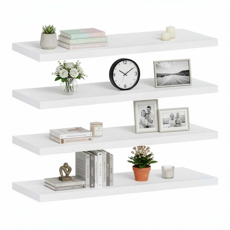 Scurta descriere: Set de patru rafturi de perete, realizate din MDF cu suport metalic, concepute pentru organizarea si expunerea obiectelor decorative sau functionale. Designul simplu permite integrarea usoara in living, dormitor sau birou.
