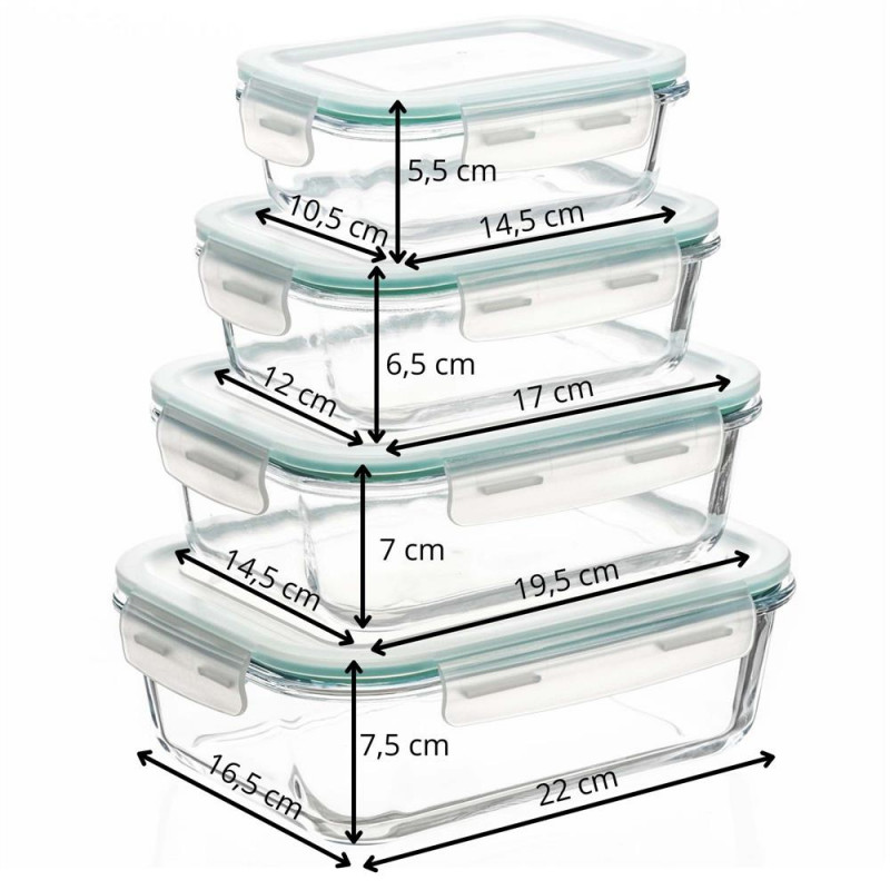 Continut set: Recipient cu capac 0,35 L – 14,5 x 10,5 x 5,5 cm Recipient cu capac 0,6 L – 17 x 12 x 6,5 cm Recipient cu capac 1,0 L – 19,5 x 14,5 x 7 cm Recipient cu capac 1,45 L – 22 x 16,5 x 7,5 cm