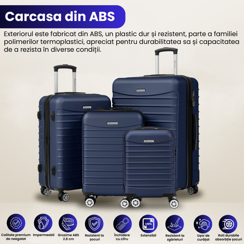 Perfecte pentru calatorii cu avionul, setul de 4 trolere cu dimensiunile de 40 x 30 x 20 cm (cu roti detasabile), 55 x 36 x 20 cm, 66 x 41 x 26-31 cm si 77 x 49 x 31-36 cm dispune de 4 roti duble cu rotatie de 360° pentru manevrabilitate usoara. Fabricate din ABS rezistent, au manere telescopice, cifru si fermoar antifurt pentru siguranta.