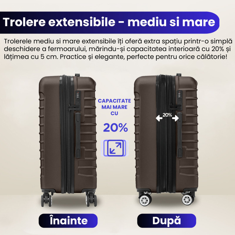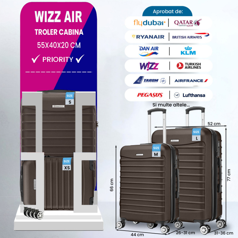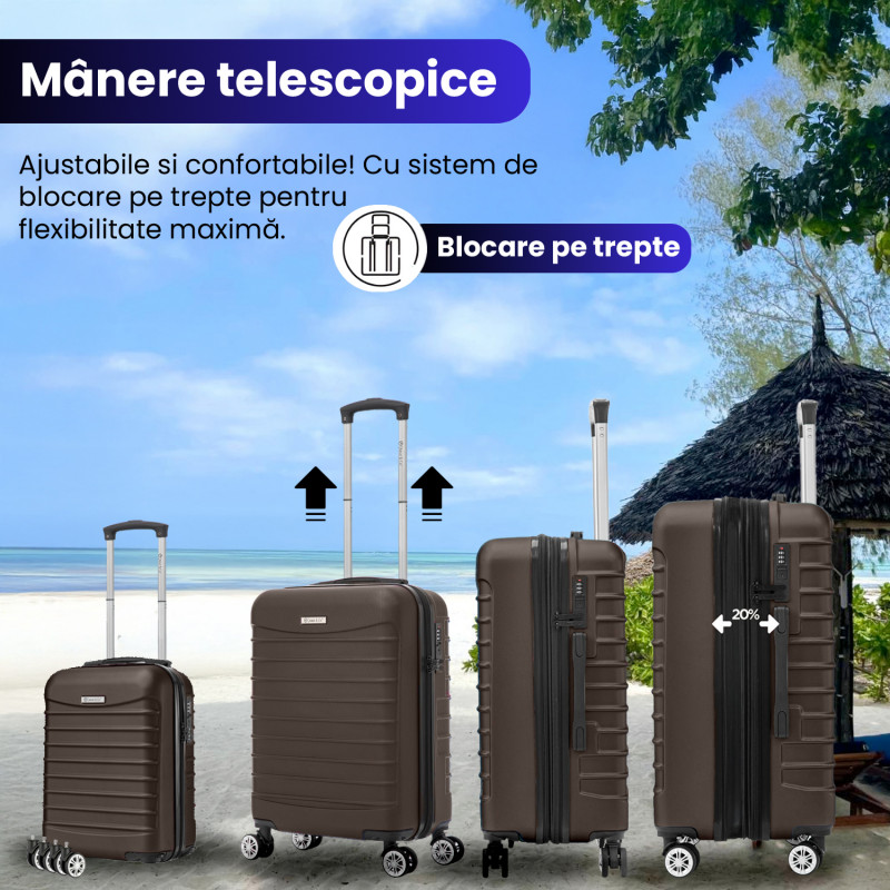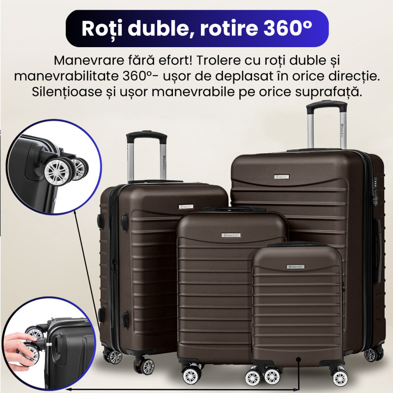 Perfecte pentru calatorii cu avionul, setul de 4 trolere cu dimensiunile de 40 x 30 x 20 cm (cu roti detasabile), 55 x 36 x 20 cm, 66 x 41 x 26-31 cm si 77 x 49 x 31-36 cm dispune de 4 roti duble cu rotatie de 360° pentru manevrabilitate usoara. Fabricate din ABS rezistent, au manere telescopice, cifru si fermoar antifurt pentru siguranta.