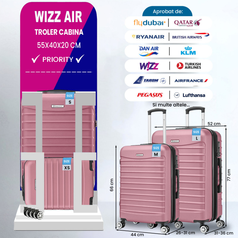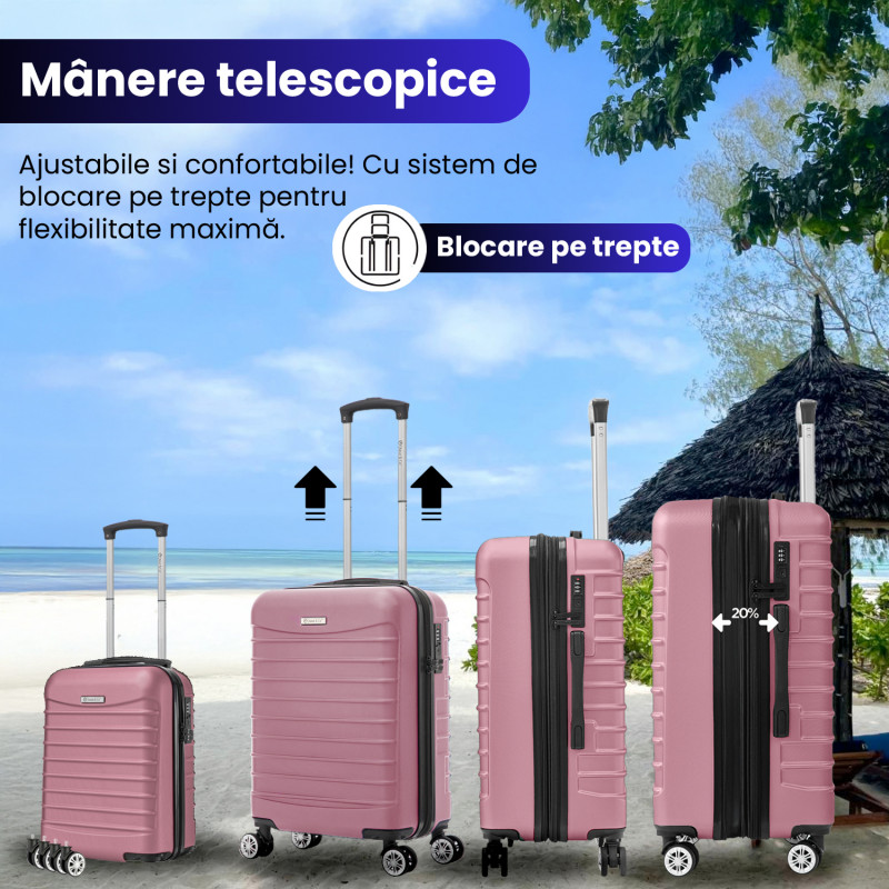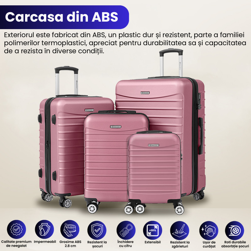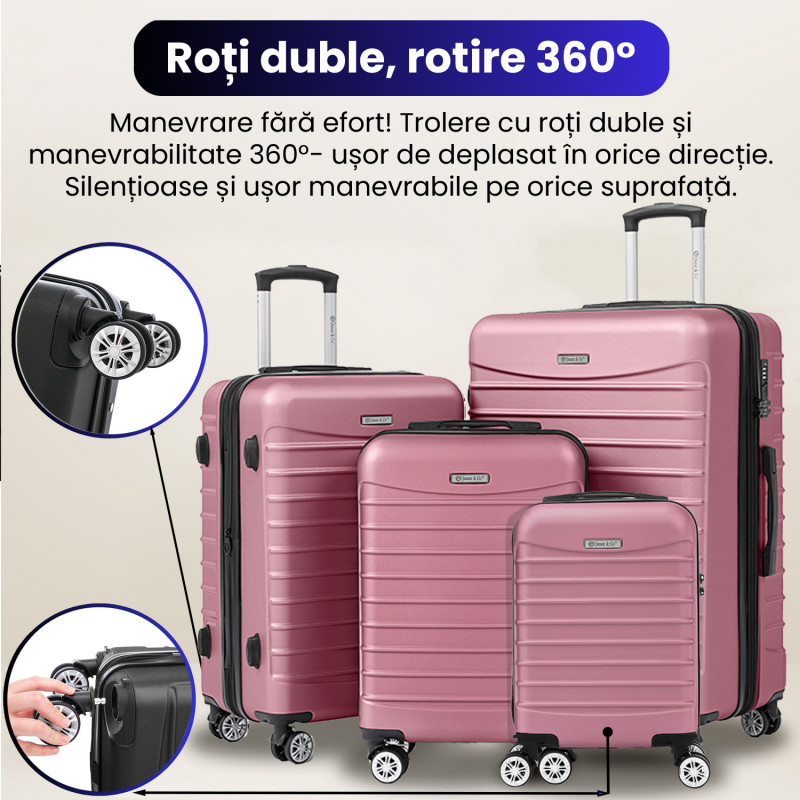 Perfecte pentru calatorii cu avionul, setul de 4 trolere cu dimensiunile de 40 x 30 x 20 cm (cu roti detasabile), 55 x 36 x 20 cm, 66 x 41 x 26-31 cm si 77 x 49 x 31-36 cm dispune de 4 roti duble cu rotatie de 360° pentru manevrabilitate usoara. Fabricate din ABS rezistent, au manere telescopice, cifru si fermoar antifurt pentru siguranta.