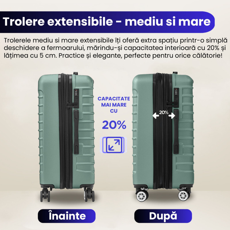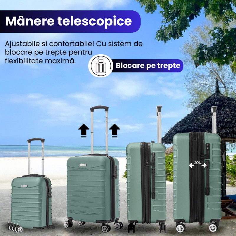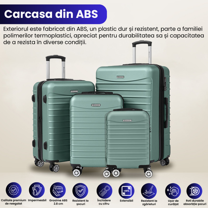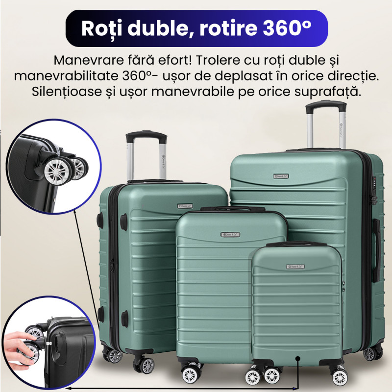 Perfecte pentru calatorii cu avionul, setul de 4 trolere cu dimensiunile de 40 x 30 x 20 cm (cu roti detasabile), 55 x 36 x 20 cm, 66 x 41 x 26-31 cm si 77 x 49 x 31-36 cm dispune de 4 roti duble cu rotatie de 360° pentru manevrabilitate usoara. Fabricate din ABS rezistent, au manere telescopice, cifru si fermoar antifurt pentru siguranta.